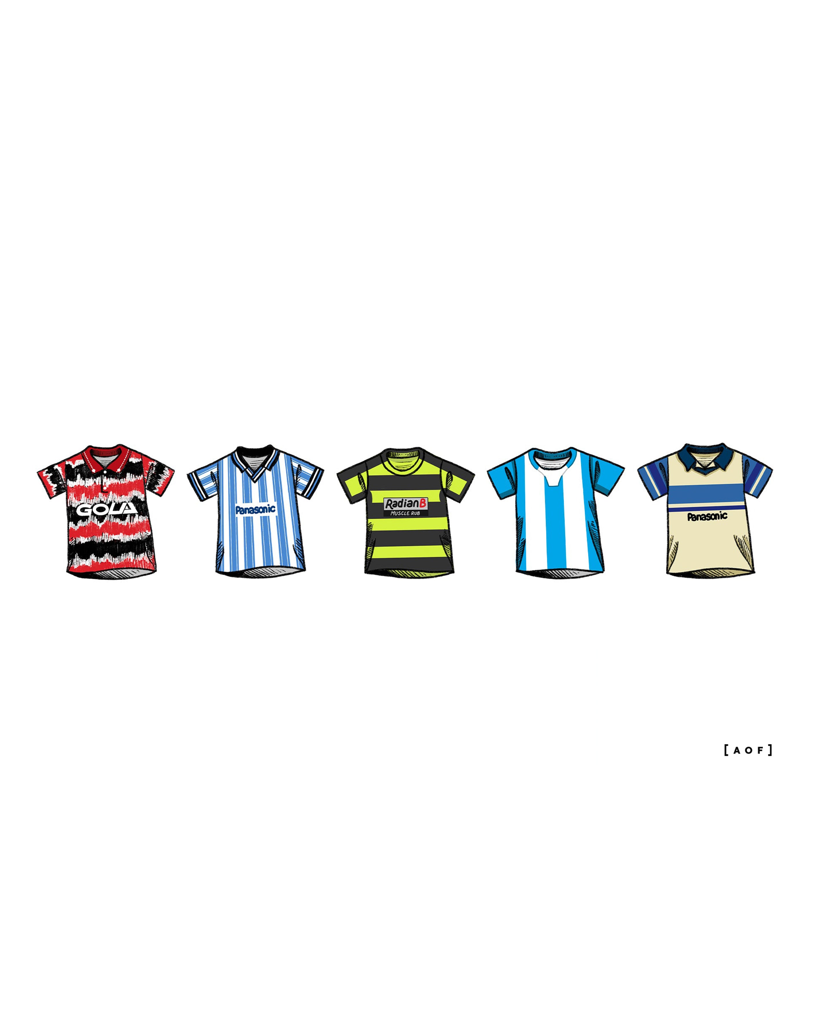 - Design: A collection of classic football shirts.